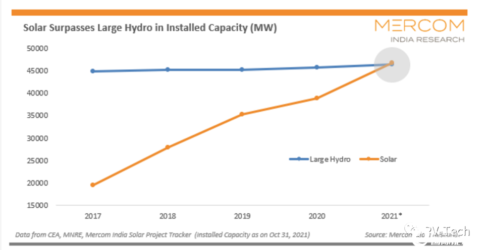 According to the Mercom India Solar Project Tracking Report, the Central Electricity Authority of India (CEA) and the Ministry of New Energy and Renewable Energy (MNRE), solar energy has surpassed large hydropower. As of October 31, 2021, the installed capacity of large-scale hydropower in India is 46.51GW.