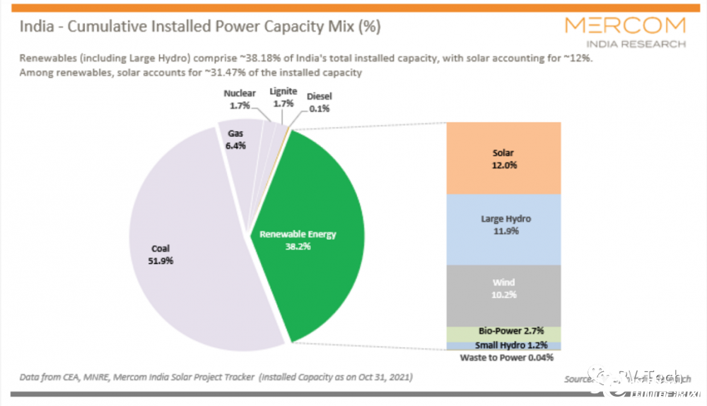 As of October 31, 2021, India's total installed capacity is 390.17GW. Among them, renewable energy including large-scale hydropower is about 149GW, accounting for 38.2% of the total installed capacity of India. Solar energy accounts for 12% of all types of installed capacity and 31.47% of renewable energy installed capacity.